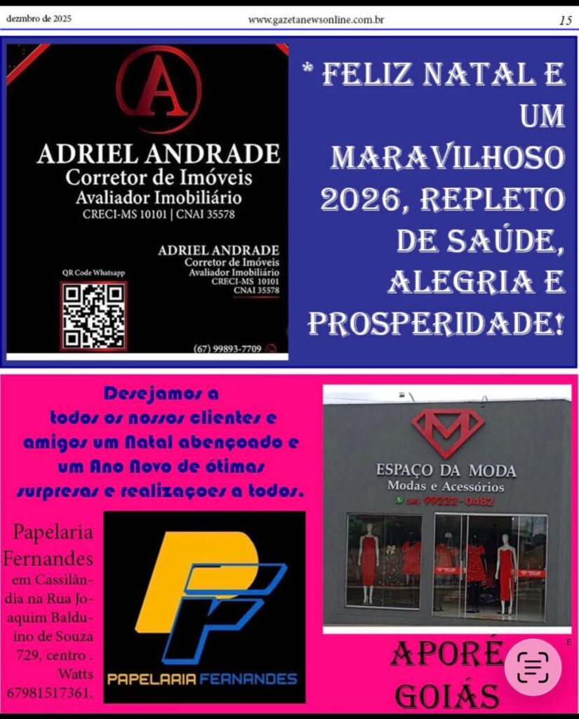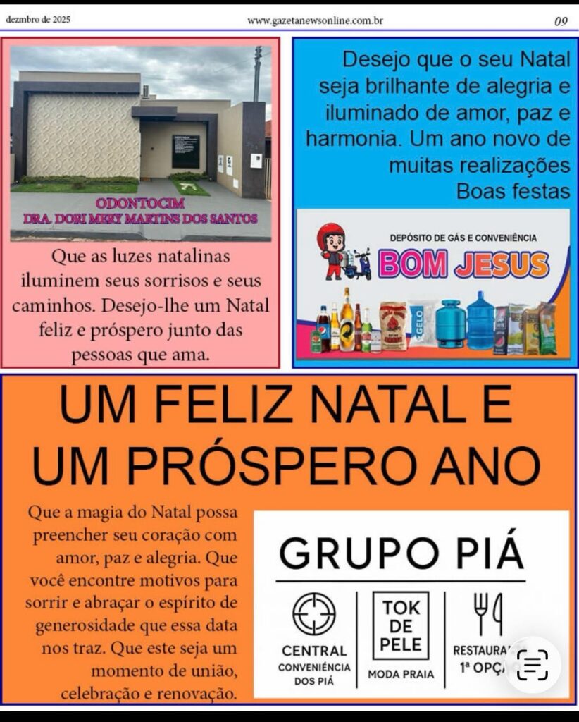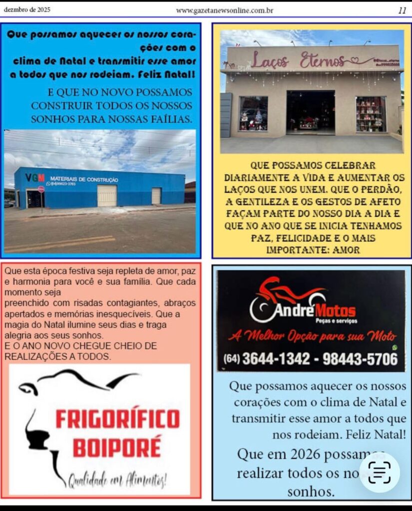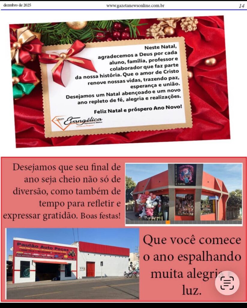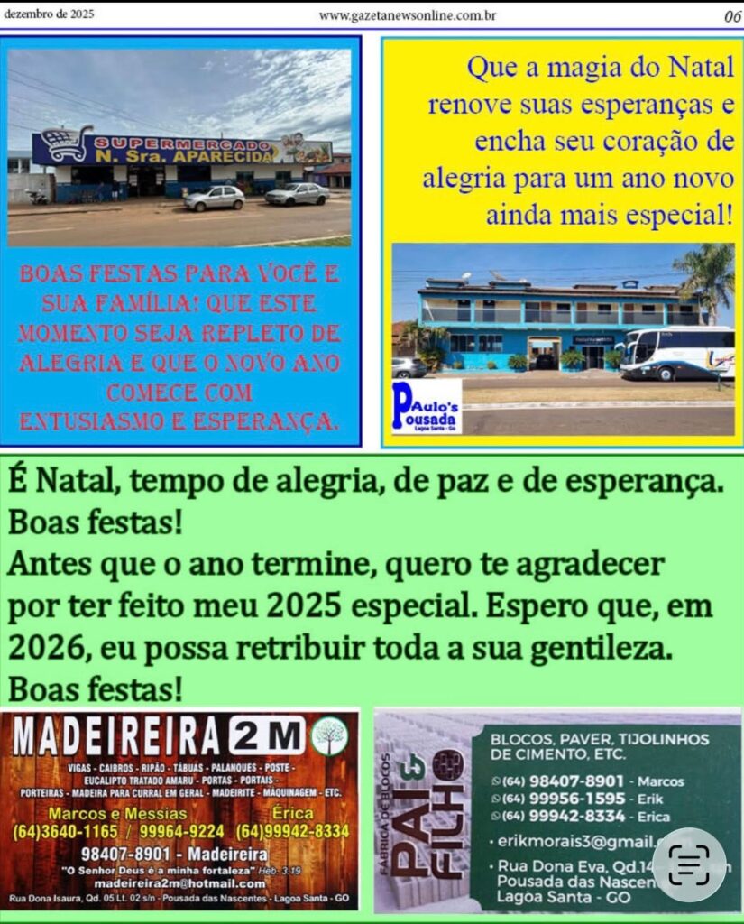 EDIÇÃO ESPECIAL DE NATAL IMPRESSA EM FORMA DE DIGITAL DO SEU JORNAL Gazeta 21/12/2025 Aporé - GO, Caçu-GO, Cassilândia - MS, Itajá - GO, Itarumã, Lagoa Santa GO, Últimas Notícias Leave a comment 83 Views Related Articles CASA DO TRABALHADOR INFORMA 13 horas ago COMUNICADO EDUCAÇÃO EM APORE 13 horas ago CÂMARA MUNICIPAL DE ITAJÁ ABRIU TRABALHO LEGISLATIVO NO MÊS DE FEVEREIRO 13 horas ago Confira a nossa edição impressa aqui na forma digital. Edição especial de Natal, a edição mais charmosa do ano. Share Facebook Twitter Stumbleupon LinkedIn Pinterest