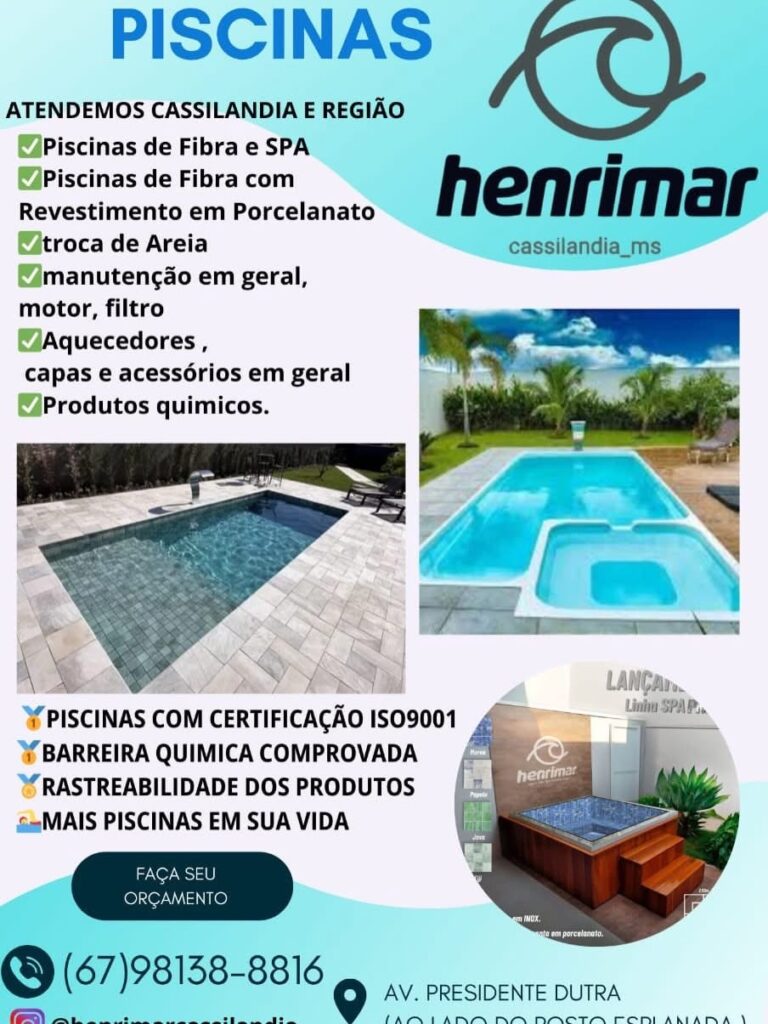 Henrimar piscinas de Cassilandia, tudo que você precisa desde piscina, produtos para manutenção, a tudo para manutenção deixando sua piscina do jeito que você gostaria é só na Henrimar piscinas de Cassilandia.
