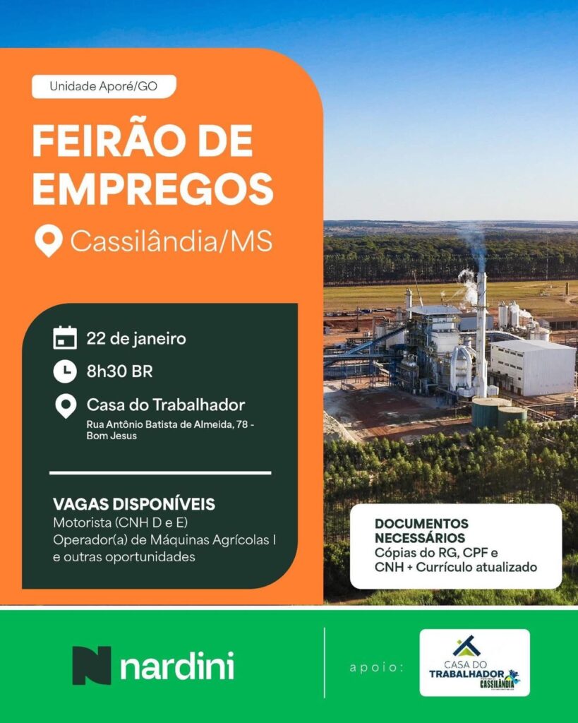 FEIRÃO DE EMPREGOS EM CASSILÂNDIA Gazeta 21/01/2026 Cassilândia - MS, Últimas Notícias Leave a comment 56 Views Related Articles PROMOÇÃO CENTER MIX 12 horas ago SEBRAE MS GOVERNO DO ESTADO E PREFEITURA LANÇAM PLANO DE DESENVOLVIMENTO MUNICIPAL EM CASSILÂNDIA 18 horas ago QUINTA DA BOA FORMA NA DROGA SOL 18 horas ago A empresa Nardini estará amanhã às 7:30 ms na Casa do Trabalhador de Cassilândia fazendo entrevistas para vagas de trabalho. Interessados comparecer com documentos pessoais e currículo em mãos. Share Facebook Twitter Stumbleupon LinkedIn Pinterest