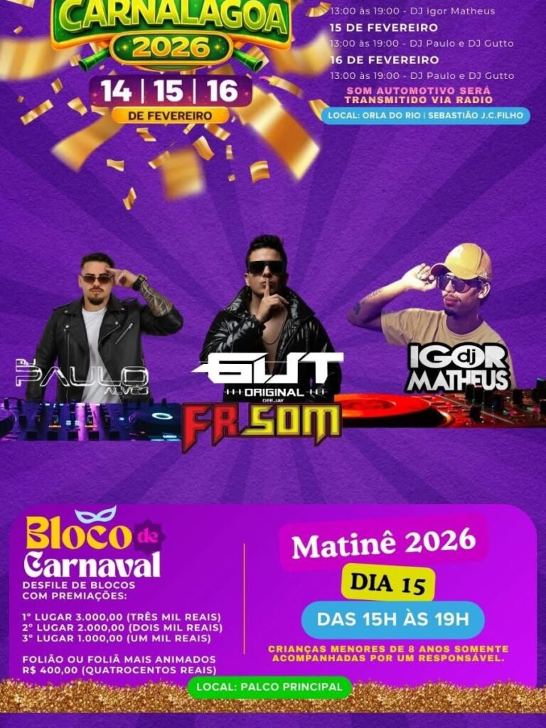 O CarnaLagoa 2026 já tem data marcada e promete três dias de muita alegria, música e diversão para toda a família!