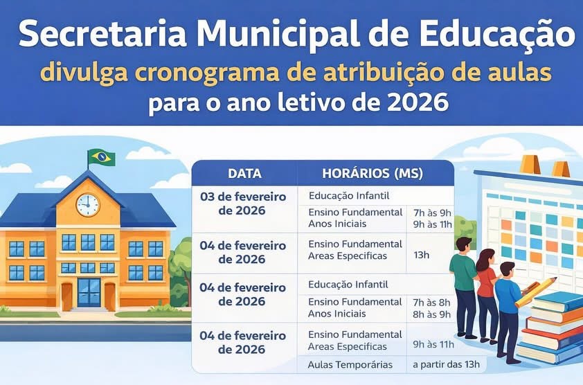 A Secretaria Municipal de Educação de Cassilândia divulgou o cronograma oficial para a atribuição de aulas, aulas excedentes e designações referentes ao ano letivo de 2026, envolvendo professores do quadro efetivo da Rede Municipal de Educação e candidatos classificados no Processo Seletivo Simplificado para contratação temporária.