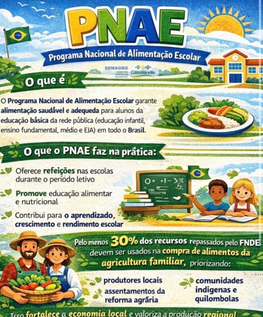 Está aberta em Cassilândia a chamada pública do Programa Nacional de Alimentação Escolar (PNAE), iniciativa fundamental para garantir alimentação saudável e de qualidade aos alunos da educação básica da rede pública, abrangendo a educação infantil, o ensino fundamental, o ensino médio e a Educação de Jovens e Adultos (EJA).