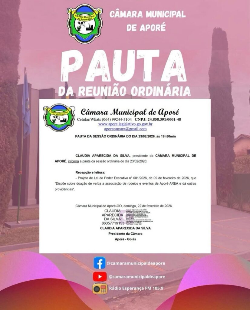 CÂMARA MUNICIPAL DE APORE INFORMA PAUTA DA REUNIÃO ORDINÁRIA Gazeta 2 semanas ago Aporé - GO, Últimas Notícias Leave a comment 53 Views Related Articles CASA DO TRABALHADOR INFORMA 15 horas ago COMUNICADO EDUCAÇÃO EM APORE 15 horas ago CÂMARA MUNICIPAL DE ITAJÁ ABRIU TRABALHO LEGISLATIVO NO MÊS DE FEVEREIRO 15 horas ago Share Facebook Twitter Stumbleupon LinkedIn Pinterest