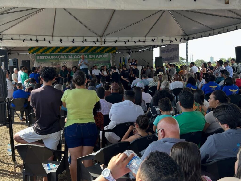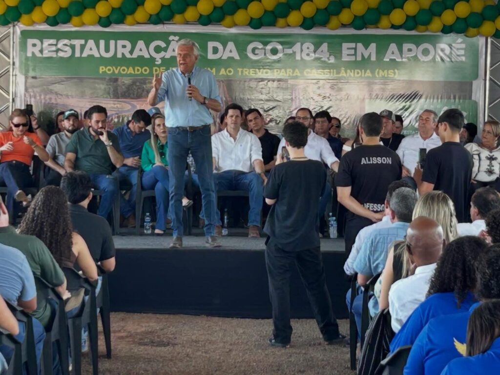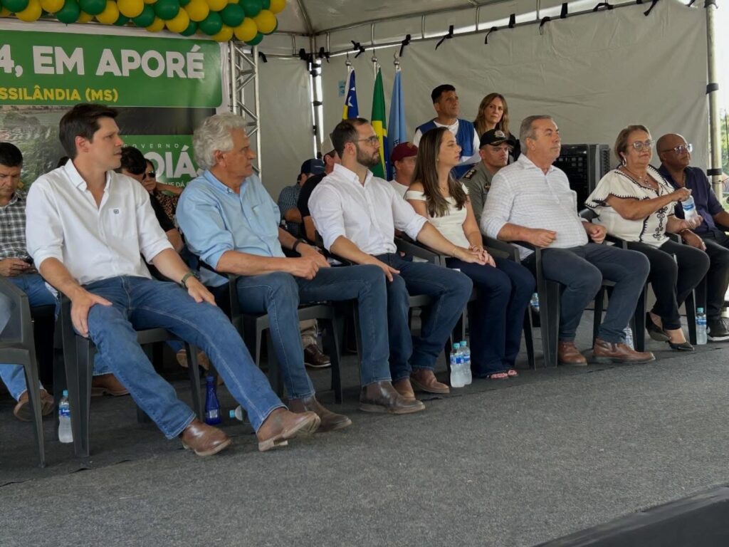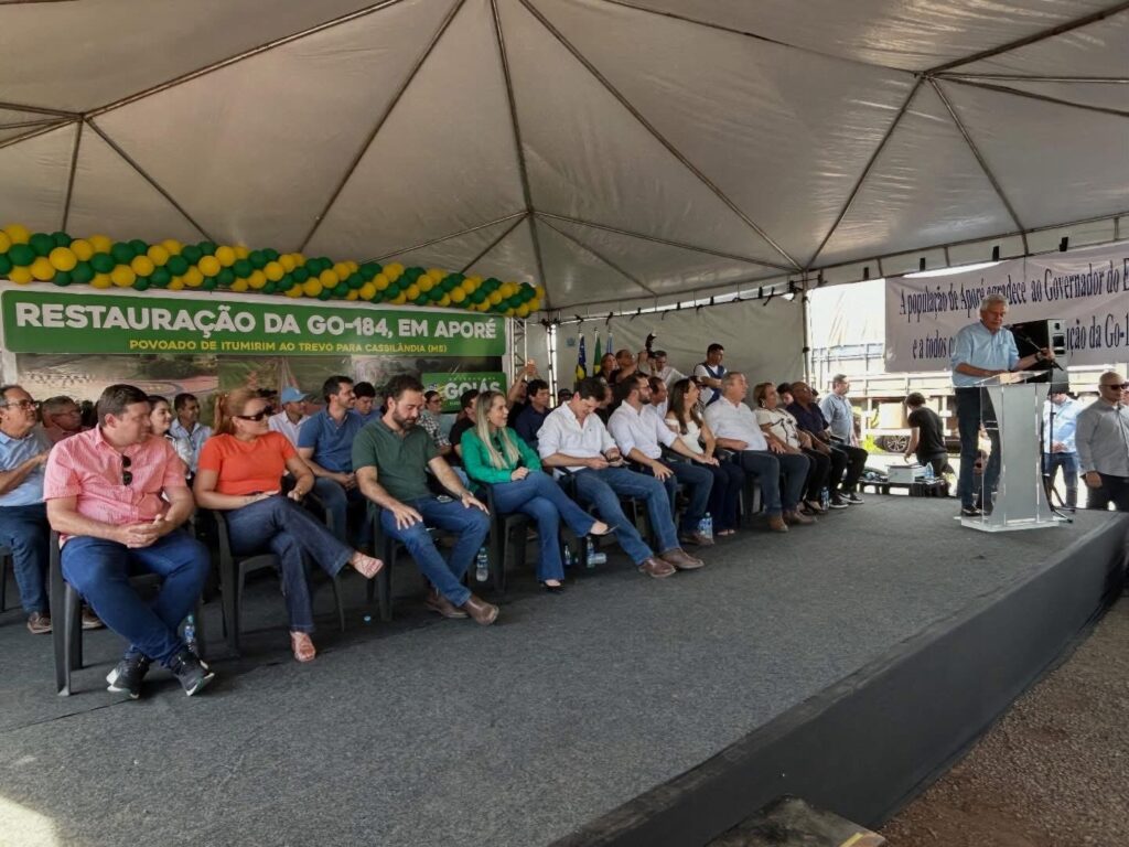 O governador do estado Ronaldo Caiado esteve ontem a Aporé acompanhado do vice-governador Daniel Vilela e comitiva. A visita foi para inaugurar oficialmente a restauração GOS 184 e 302. Estas importantes rodovias cortam o sudoeste de Goiás e são muito importante para um progresso de desenvolvimento da região. Foram mais de 90 km de reconstrução que custaram os cofres do estado mais de 300 milhões de reais, segundo o próprio governador. O trecho que recebeu este benefício vai do Distrito de Iumirim em Aporé até o trevo que liga a cidade de Cassilândia Mato Grosso do Sul. Estiveram presentes ao local além do governador e a comitiva o prefeito Leonardo Carvalho, a primeira dama Geovana, a presidente da Câmara Cláudia do Povo, vereadores Aporé, prefeitos de toda região, lideranças políticas locais e regionais, secretários da atual administração além da comunidade local. A solenidade aconteceu no alojamento da empresa CCL responsável pelas obras, com início às 15h00 horas. Veja alguns fleches colhidos pela nossa reportagem na tarde de ontem.
