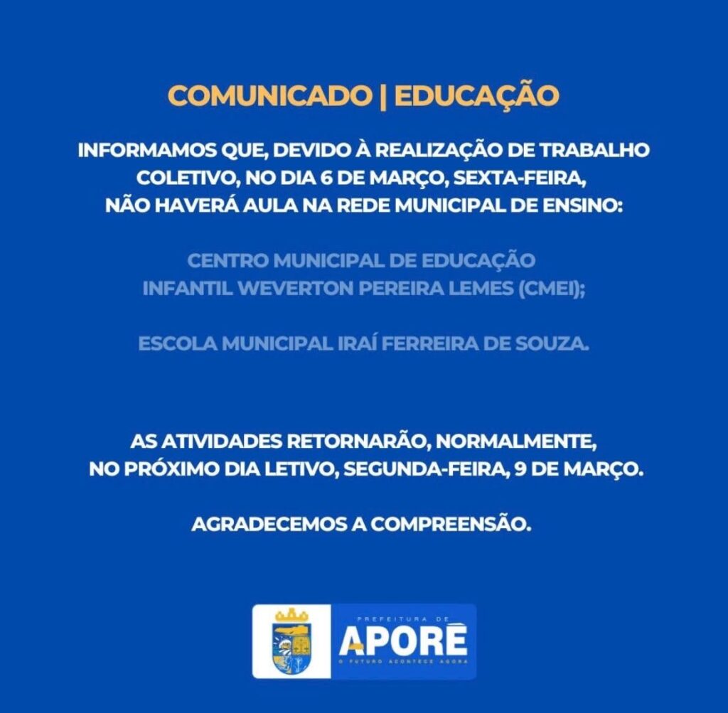 haverá aula nesta sexta-feira, 6 de março, na rede municipal de ensino, em razão da realização de trabalho coletivo nas unidades escolares.