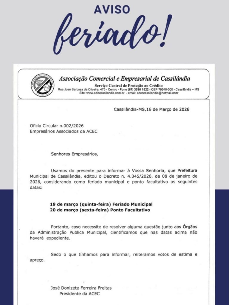 ASSOCIAÇÃO COMERCIAL E EMPRESARIAL DE CASSILÂNDIA INFORMA Gazeta 2 horas ago Cassilândia - MS, Últimas Notícias Leave a comment 27 Views Related Articles CASSILÂNDIA ABRE INSCRIÇÕES PARA O V FESTIVAL DE MÚSICA ESTUDANTIL 37 minutos ago DIA DO CONSUMIDOR NO SUPERMERCADO MASTER LOJAS 1 E 2 2 horas ago TERÇA E QUARTA VERDE NO SUPERMERCADO REZENDE 2 horas ago Share Facebook Twitter Stumbleupon LinkedIn Pinterest