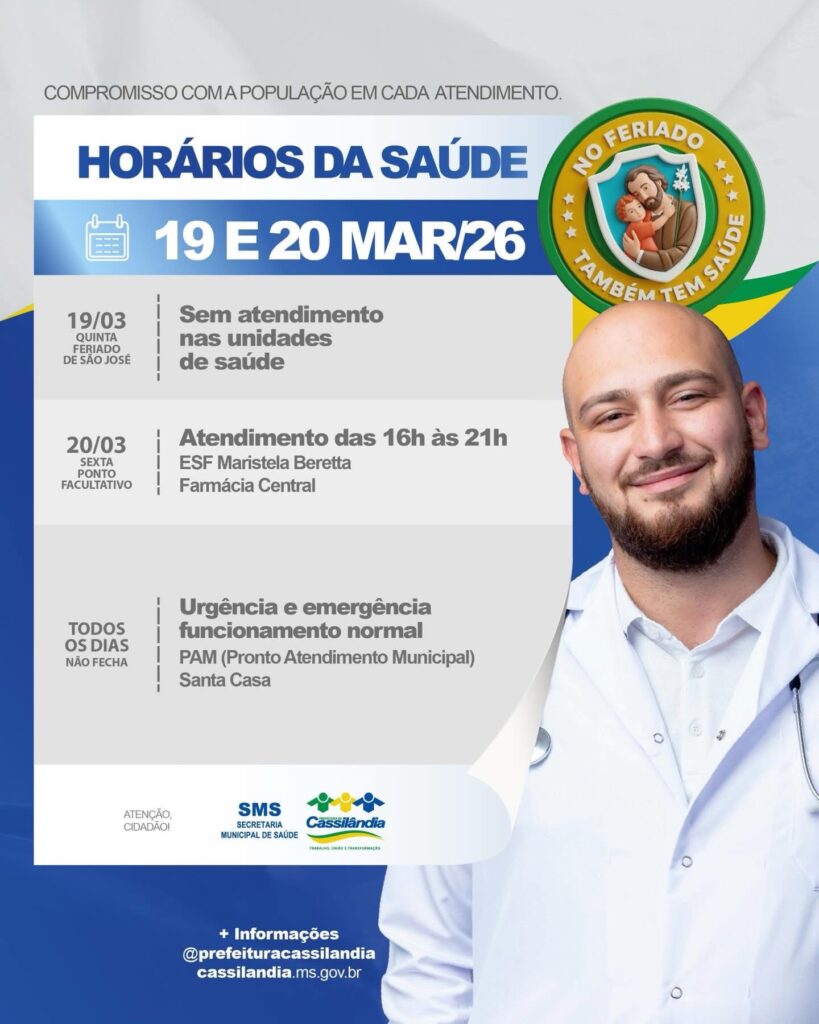 A Secretaria Municipal de Saúde de Cassilândia divulgou resolução que estabelece o horário de funcionamento das unidades de saúde durante o feriado municipal do Dia do Padroeiro São José, celebrado em 19 de março.