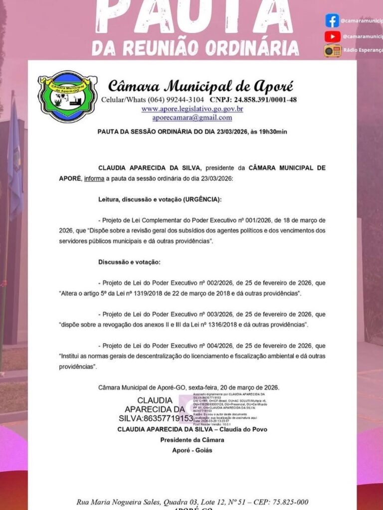 CÂMARA MUNICIPAL DE APORE INFORMA PAUTA DA SESSÃO DE HOJE Gazeta 23/03/2026 Aporé - GO, Últimas Notícias Leave a comment 57 Views Related Articles SEBRAE MS GOVERNO DO ESTADO E PREFEITURA LANÇAM PLANO DE DESENVOLVIMENTO MUNICIPAL EM CASSILÂNDIA 5 horas ago QUINTA DA BOA FORMA NA DROGA SOL 5 horas ago QUINTA MALUCA NO SUPERMERCADO REZENDE 5 horas ago Share Facebook Twitter Stumbleupon LinkedIn Pinterest