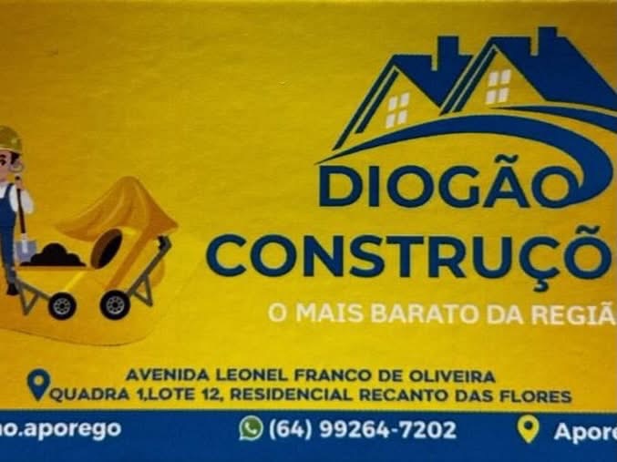 Diogão Construções esta atendendo em novo endereço em Aporé. Na avenida Leonel Franco de Oliveira, Q. 1 Lote 12, Recanto das Flores.