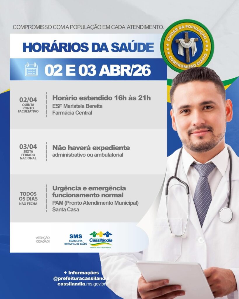 A Prefeitura de Cassilândia informa que houve uma correção na arte anteriormente divulgada referente ao horário de funcionamento dos serviços de saúde durante o período informado.