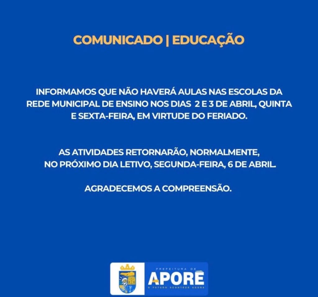 PREFEITURA MUNICIPAL DE APORE INFORMA Gazeta 3 semanas ago Aporé - GO, Últimas Notícias Leave a comment 39 Views Related Articles SEBRAE MS GOVERNO DO ESTADO E PREFEITURA LANÇAM PLANO DE DESENVOLVIMENTO MUNICIPAL EM CASSILÂNDIA 3 horas ago QUINTA DA BOA FORMA NA DROGA SOL 3 horas ago QUINTA MALUCA NO SUPERMERCADO REZENDE 3 horas ago Em razão do feriado, não haverá aulas na rede municipal de ensino nos dias 2 e 3 de abril, quinta e sexta-feira.As atividades retornarão, normalmente, na segunda-feira, 6 de abril.Prefeitura Municipal de Aporé.Gestão 2025/2028. Share Facebook Twitter Stumbleupon LinkedIn Pinterest