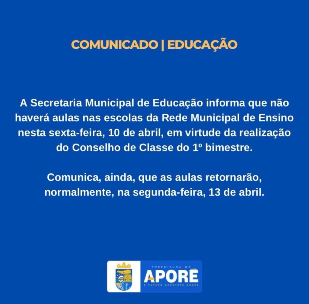 A Secretaria Municipal de Educação informa que não haverá aulas nas escolas da Rede Municipal de Ensino nesta sexta-feira, 10 de abril, em virtude da realização do Conselho de Classe do 1° bimestre.