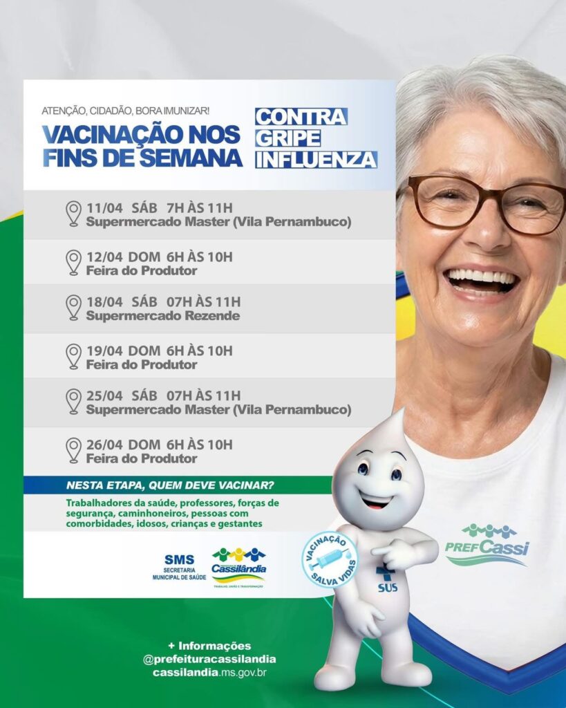 A Prefeitura de Cassilândia, por meio da Secretaria Municipal de Saúde, está promovendo uma importante ação de imunização contra a gripe (Influenza), com atendimento especial aos finais de semana durante o mês de abril.