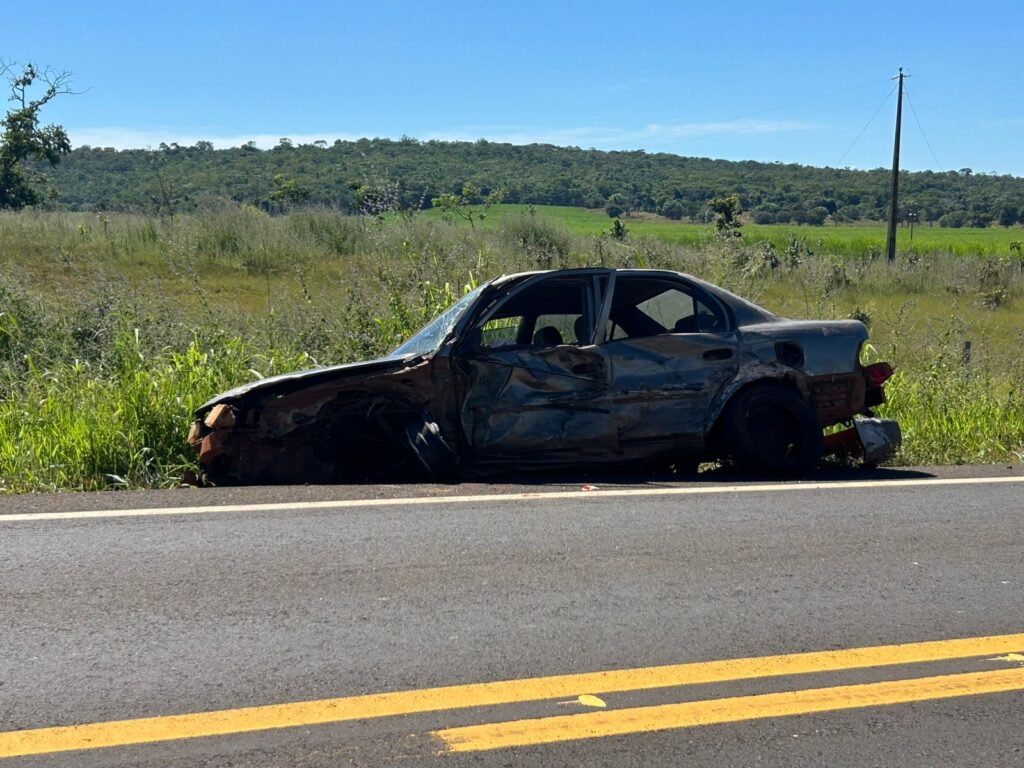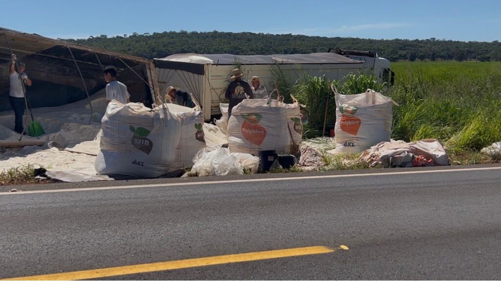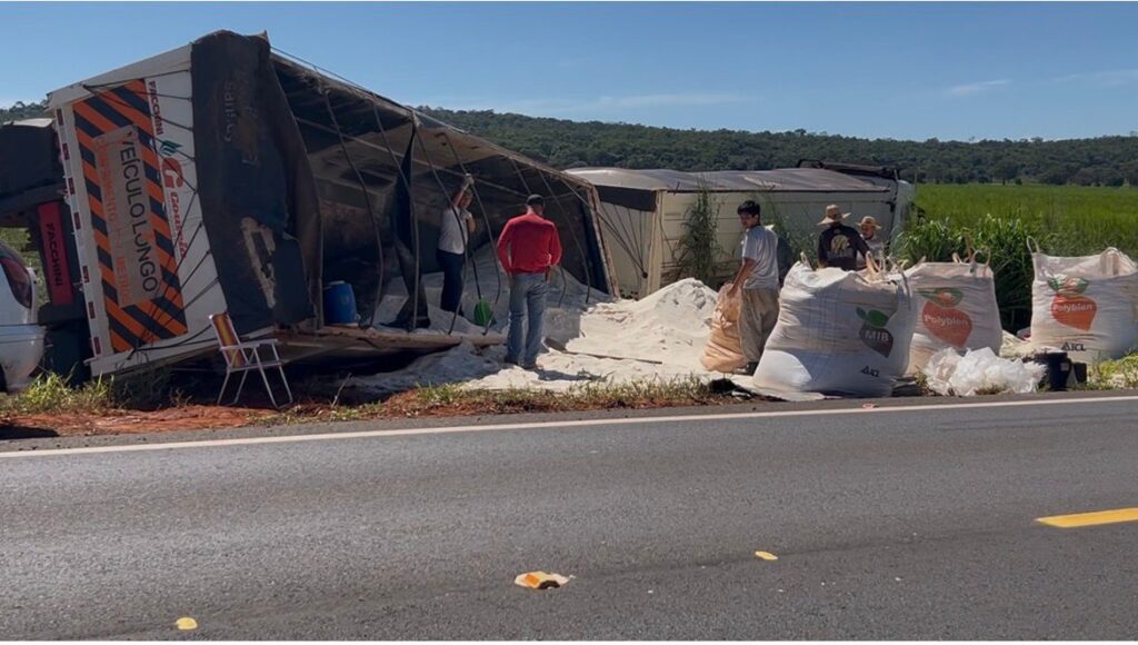 Na foto o veículo que ficou totalmente danificado e o bitrem com o vagão traseiro tombado e o açúcar espalhado pela margem da estrada.