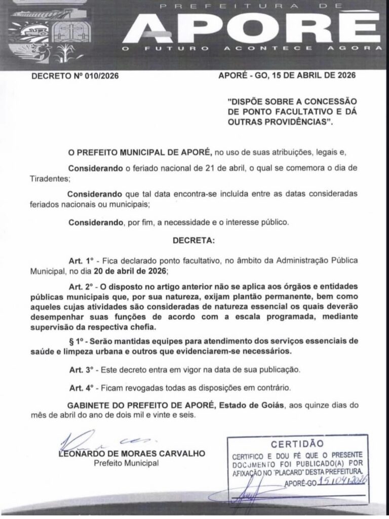PREFEITURA MUNICIPAL DE APORE INFORMA FERIADO Gazeta 6 dias ago Aporé - GO, Últimas Notícias Leave a comment 59 Views Related Articles RANKING NACIONAL DE RODEIO EM TOUROS 49 segundos ago RANKING MUNDIAL DE RODEIO EM TOUROS 2 minutos ago SHOW DE GUSTTAVO LIMA EM BARRETOS TEM DATA MARCADA 4 minutos ago DECRETO N° 010/2026.DISPÕE SOBRE A CONCESSÃO DE PONTO FACULTATIVO E DÁ OUTRAS PROVIDÊNCIAS.Prefeitura Municipal de Aporé.Gestão 2025/2028. Share Facebook Twitter Stumbleupon LinkedIn Pinterest