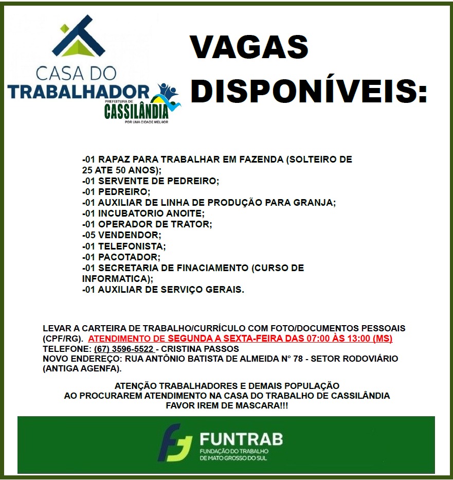 A Casa do Trabalhador de Cassilândia-MS, informa as Vagas de Emprego disponíveis para a população Gazeta 11/11/2021 Cassilândia - MS, Últimas Notícias Leave a comment 442 Views Related Articles PROMOÇÃO CENTER MIX 13 horas ago SEBRAE MS GOVERNO DO ESTADO E PREFEITURA LANÇAM PLANO DE DESENVOLVIMENTO MUNICIPAL EM CASSILÂNDIA 20 horas ago QUINTA DA BOA FORMA NA DROGA SOL 20 horas ago Share Facebook Twitter Stumbleupon LinkedIn Pinterest